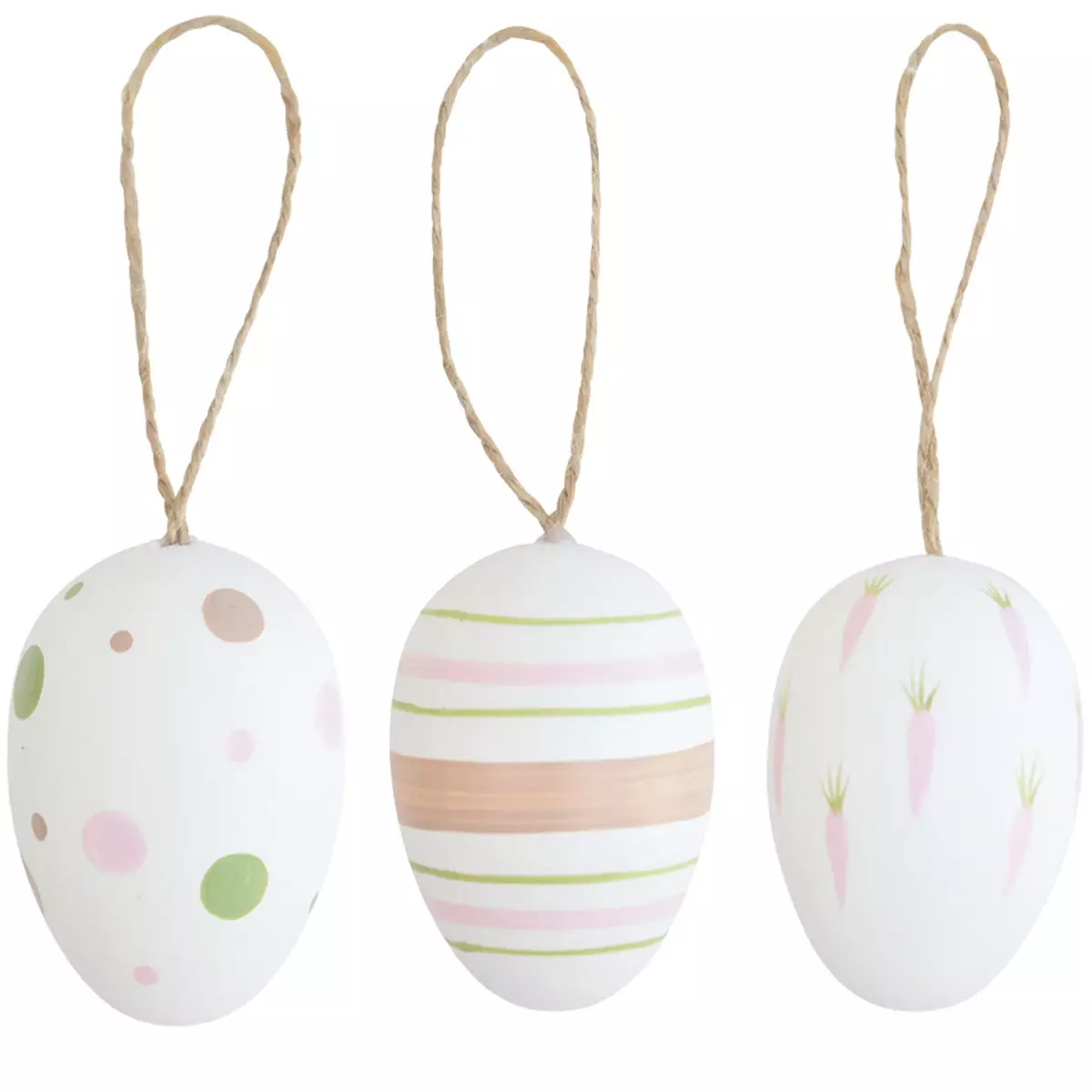 Luo kotiisi keväistä ja iloista tunnelmaa näillä valkoisilla pääsiäismunilla. Tyylikkäät ja kevyet koristemunat sopivat täydellisesti pääsiäiskoristeluun, ja niiden raita-, pallo- ja porkkanakuviot tuovat hauskan ja leikkisän ilmeen kattauksiin, oksiin ja asetelmiin.