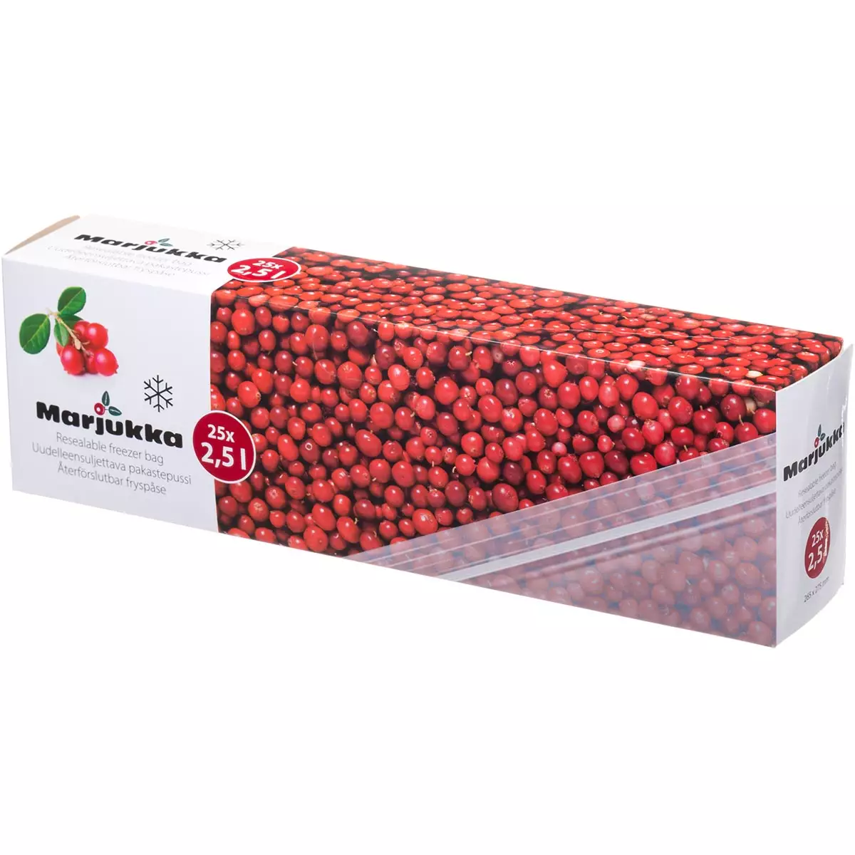 Marjukka 2,5 litran pakastepussit marjojen ja ruokien säilytykseen. Uudelleensuljettavat, kirjoitusalue, käyttölämpötila-alue -40 °C – +75 °C.