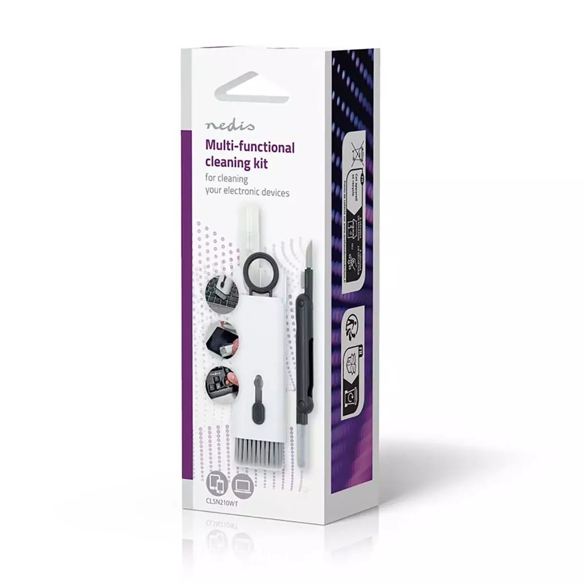 Täydellinen sarja erilaistuokaluihin elektronisten laitteiden puhdistamiseen, kuten tietokoneen näppäimistön, hiiren, puhelimen, tabletin, kuulokkeiden ja nappikuulokkeiden osalta. Sisältää mm. miniharjan, parvekesienen, kuulokkeiden puhdistuskynän, kuituliinan, suuren harjan, näppäimistön näppäinten vetimen sekä suihkepullon. Pullossa 5 ml näytönpuhdistusainetta.