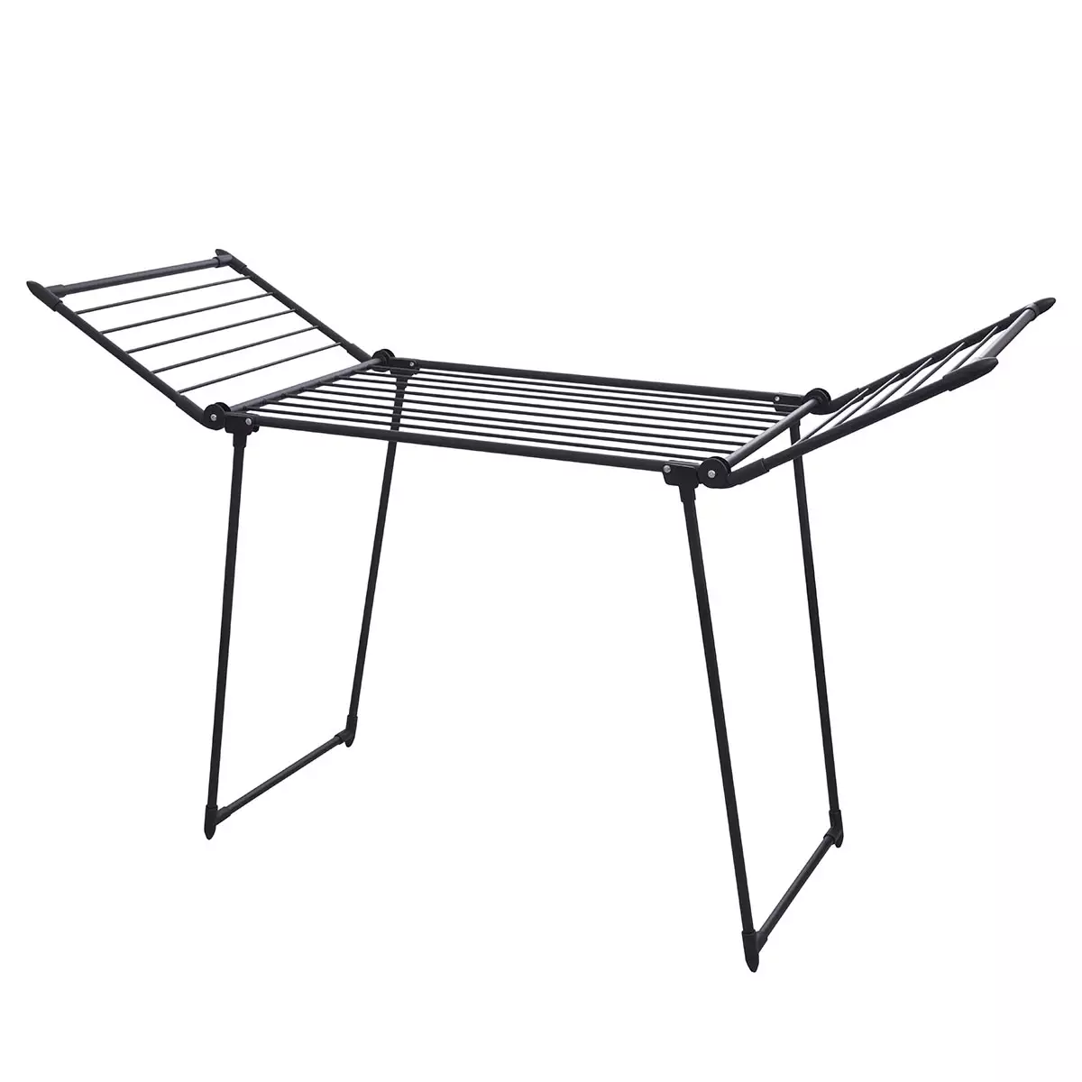 Musta pyykkiteline siivekkeillä tarjoaa runsaasti kuivatuspintaa koko perheen vaatteille. Tukeva teräsrunko ja kokoontaittuva rakenne säästävät tilaa.