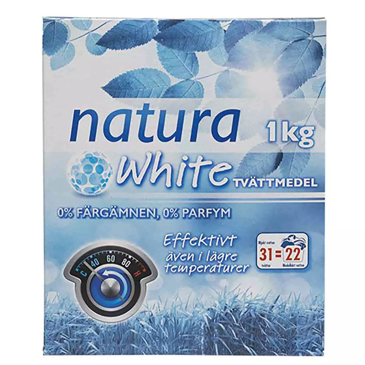 Tilaa Natura White pyykinpesujauhe 1 kg ja pidä valkopyykkisi puhtaina, raikkaina ja hellävaraisina jokaisella pesukerralla.