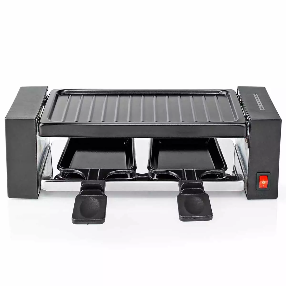 Pienet raclette-pannut työnnetään grillin alle, jossa juusto sulaa nopeasti. Tarttumaton pinnoite vähentää ruoan tarttumista ja helpottaa puhdistamista käytön jälkeen.
