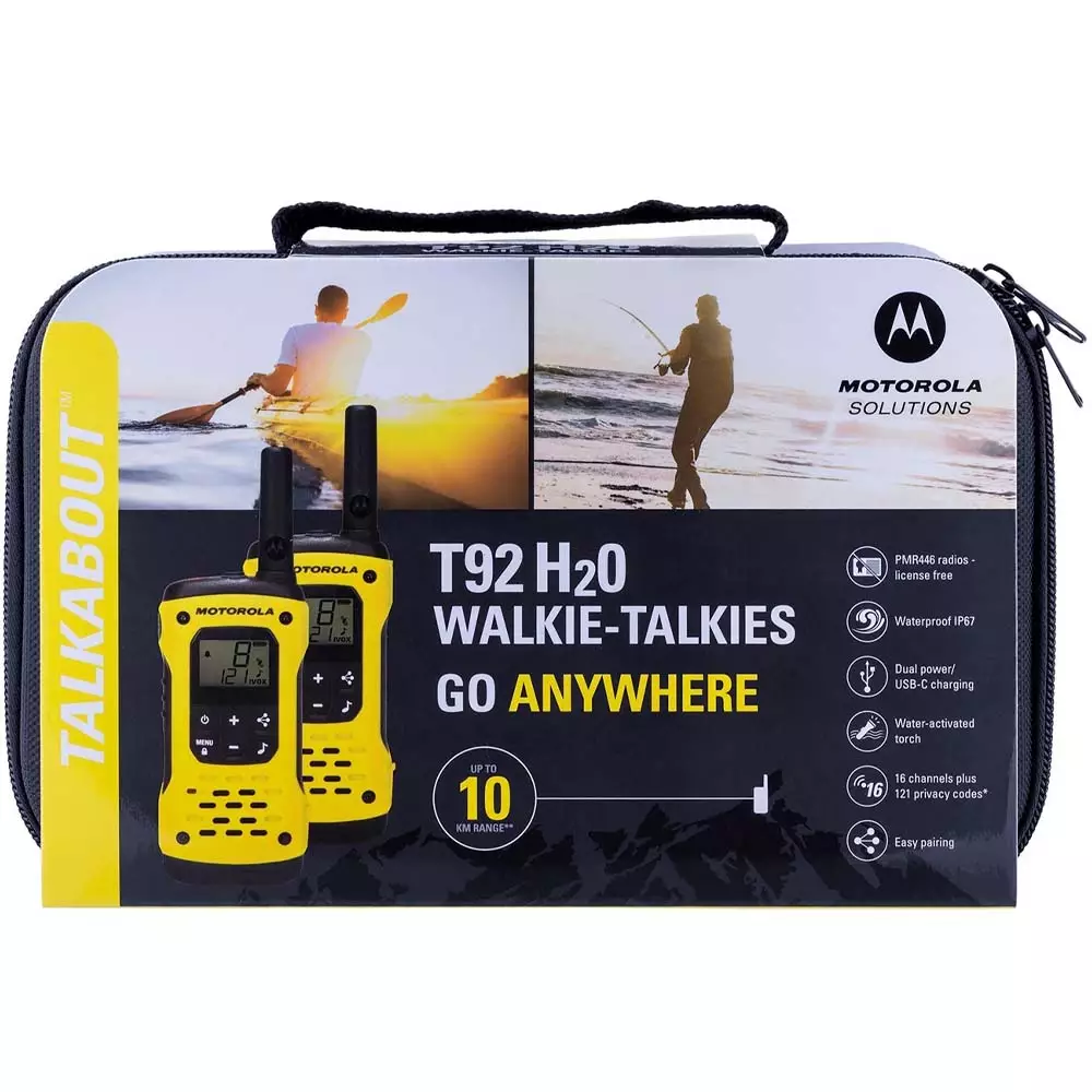 Motorola TALKABOUT T92 H2O on vedenpitävä ja kelluva PMR446-radiopuhelinsetti veneilyyn, kalastukseen ja retkeilyyn - IP67-luokitus kestää upotuksen metriin 30 minuutiksi, ja puhelimet kelluvat jos tippuvat laidan yli. Jopa 10 km kantama ja lupavapaa käyttö ilman rekisteröintiä.