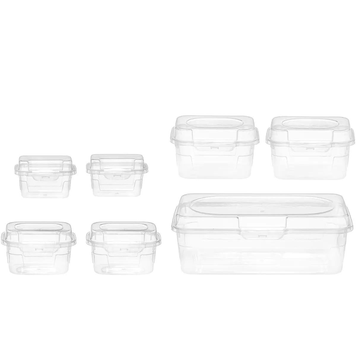 Pakkaus sisältää seitsemän rasiaa, koot 2x0,15L, 2x0,35L, 2x0,7L ja 1x2,7L. Rasioiden materiaali on PP, ja ne kestävät konepesun.