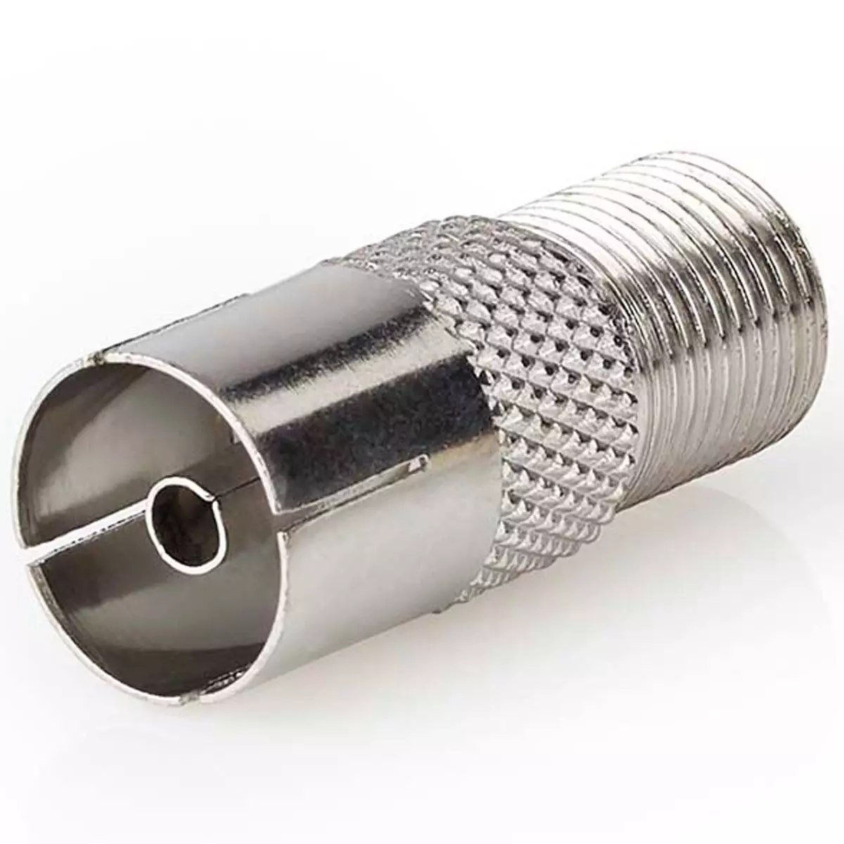 Nedis F–IEC -sovitin. F-naaras -> IEC naaras, 75 Ohm, metallirakenne. Helppo tapa muuntaa satelliitti- ja antennikaapelien liitäntä TV-pistorasiaan.