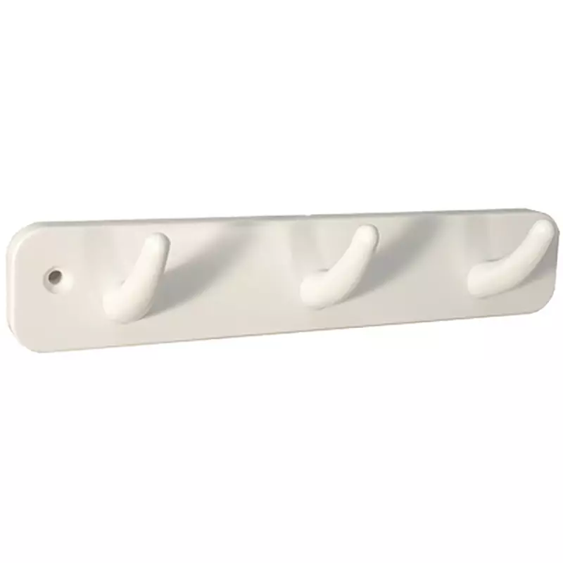 Valkoinen seinänaulakko 625 kolmella koukulla. Kevyt muovirakenne, ruuvikiinnitys ja 184 mm pituus kevyeen ripustukseen.