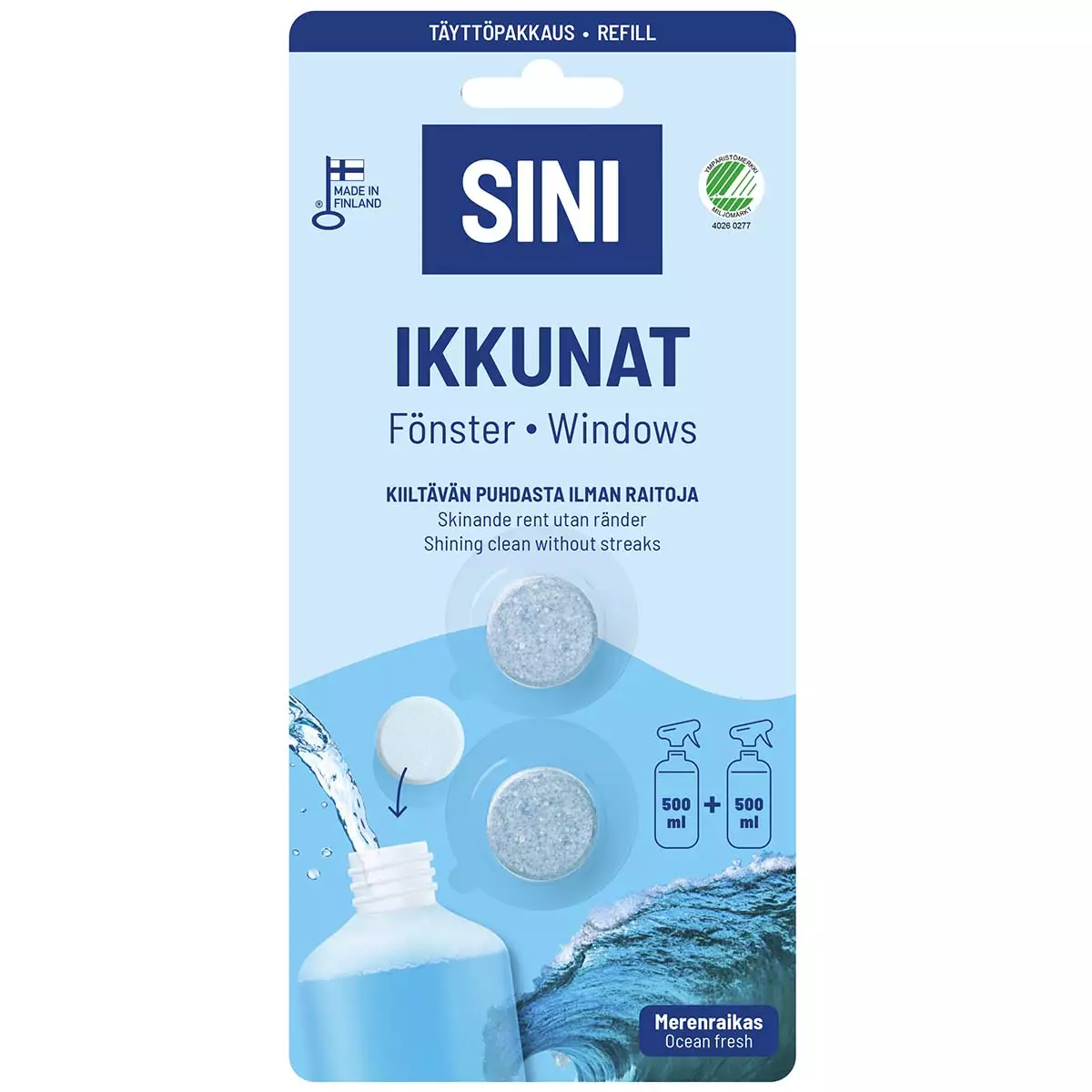 Haluatko saada ikkunasi säihkyvän puhtaiksi samalla, kun vähennät muovijätettä? Sini ikkunanpesutabletit tarjoavat kätevän ja ekologisen ratkaisun! Täyttöpakkauksessa on kaksi biohajoavaa puhdistusainetablettia, joilla saat kaksi täyttä pulloa tehokasta ikkunanpesuainetta. Yhteensopiva Sini ikkunanpesuaineen kestopullon kanssa, joten voit käyttää samaa pulloa yhä uudelleen.