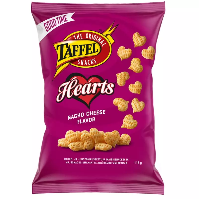 Taffel Hearts -maissisnacksit on maustettu vastuttamattoman herkullisella nacho-juustolla ja valmistettu sydämen muotoisiksi ja vastustamattoman rapeiksi. Nacho-juuston maku ja rouskuva rapeus tekee maissisipseistä täydellisen naposteltavan herkkuhetkiin niin yksin kuin yhdessä ystävien tai perheen kanssa. Gluteenittomat Taffel Hearts -sipsit sopivat monenlaisiin tilanteisiin: rouskuteltavaksi leffailtaan, illanistujaisiin tai viikonlopun viettoon.