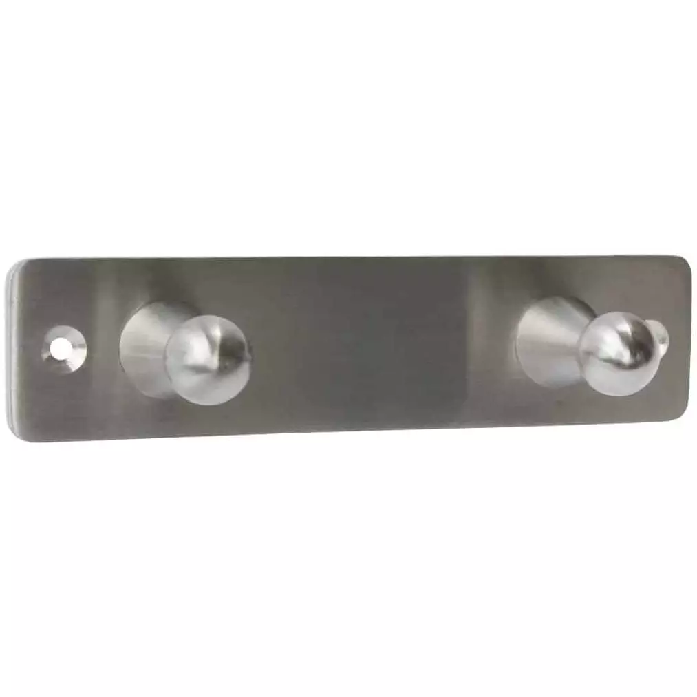 Ruostumattomasta teräksestä valmistettu naulakko kahdella koululla. Pieni naulakko on pituudeltaan 14 cm ja korkeudeltaan 3 cm.