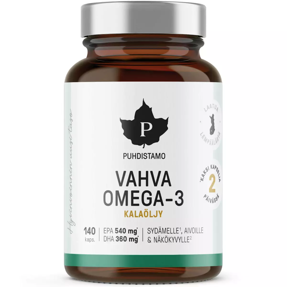 Puhdistamo Vahva Omega-3 on triglyseridimuotoinen kalaöljyvalmiste, joka täydentää välttämättömien rasvahappojen saantia ja tukee sydämen, aivojen sekä näkökyvyn normaalia toimintaa. Kapselit sisältävät Golden Omega® -kalaöljyä, joka on tunnettu puhtaudestaan ja vastuullisesta alkuperästään.