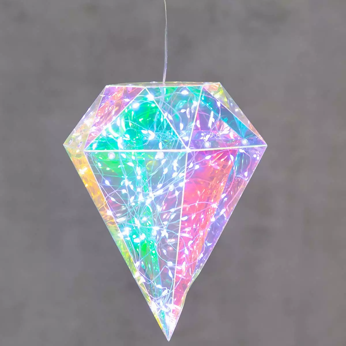 Todella upea ja näyttävä jalokivi valokoriste, joka sopii tuomaan tunnelmaa niin kotiin, mökille, terassille, parvekkeelle kuin juhla- ja tapahtumatiloihinkin. Sisustusvalaisimena toimiva jalokivi on valmistettu läpinäkyvästä PET-muovista, joka hohtaa sateenkaaren väreissä kuin aito kristalli. Upea jalokiven muotoinen kristallivalaisin sisältää yhteensä 100kpl LED-valoja, jotka ovat energiatehokkaita ja pitkäikäisiä.