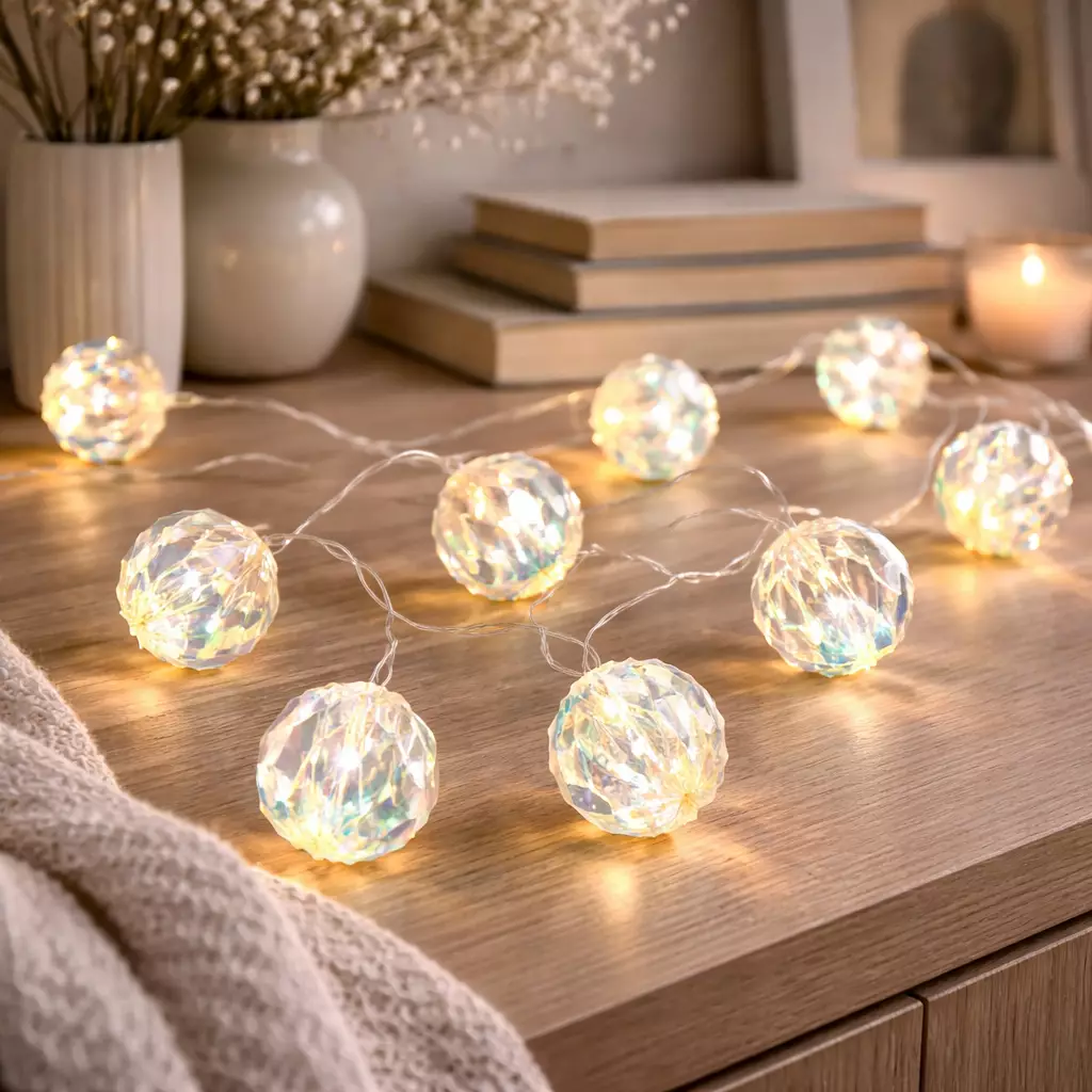 Koristepallojen särmikäs kristallimainen pinta taittaa valon upeasti eri kulmista, ja lämmin valkoinen LED-valo saa pinnat hehkumaan kullan, violetin ja sinisen sävyissä. Valosarja toimii loistavasti esimerkiksi: