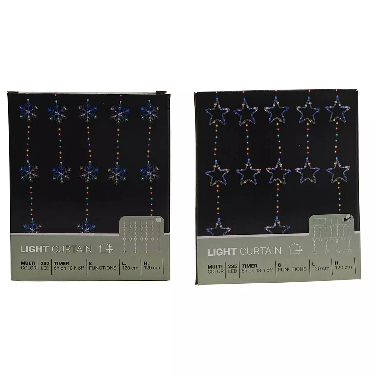Värikäs valoverho 232 LED, tähti- tai lumihiutalekuviolla. Koko 120x120 cm, 8 valotoimintoa, ajastin ja IP44-suojaus - sopii sisä- ja ulkokäyttöön.