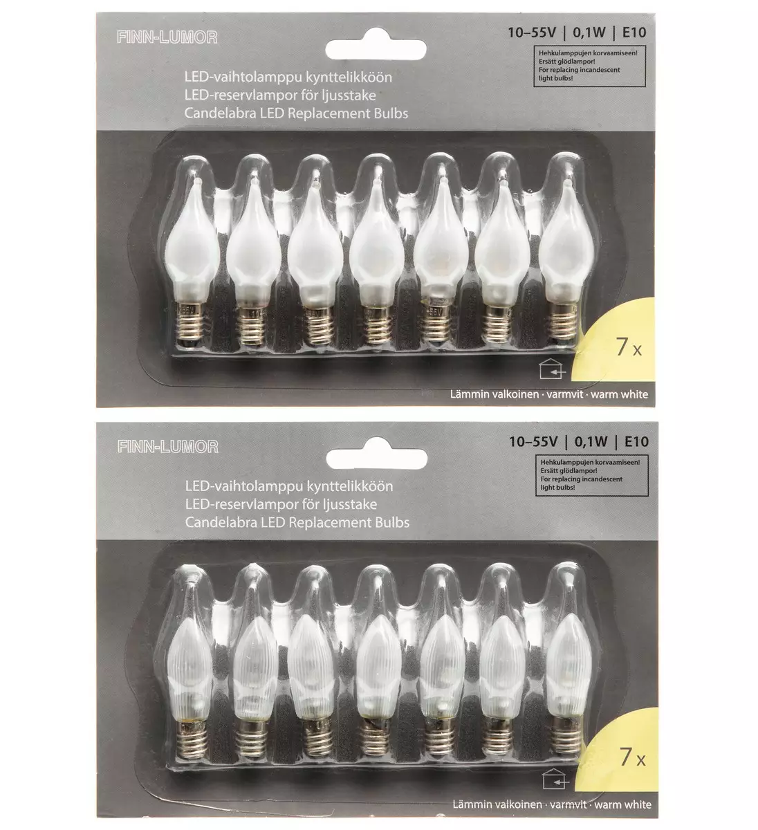 - Vaihtoehtoina uritettuja maitolasilamppuja tai kärjestä taivutettuja maitolasilamppuja, pakkaus sisältää 7 kpl vaihtolamppuja