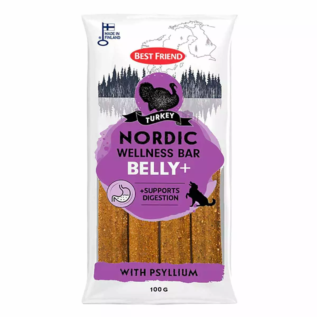 Palkitse koirasi uudella ja innovatiivisella Best Friend Nordic Wellness Bar Belly+ -herkkutangolla! Laadukkaista raaka-aineista valmistetut koiranherkut on suunniteltu edistämään koiran vatsan hyvinvointia. Vatsaystävällinen koiran makupala sisältää psylliumia, joka tukee hellävaraisesti ruoansulatusta ja vatsaa. Maistuvuutta herkkuun tuo kalkkunaproteiini. Supermaukkaat herkkupalat on valmistettu ilman viljoja, lisättyä sokeria tai muita lisäaineita.