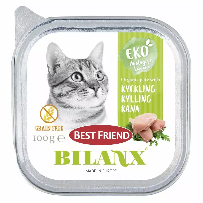 Maukas märkäruoka kissalle kätevässä annospussissa, missä on repäisyreuna. Bilanx kissanruoan makuna lihaisa kananrinta & maksa.