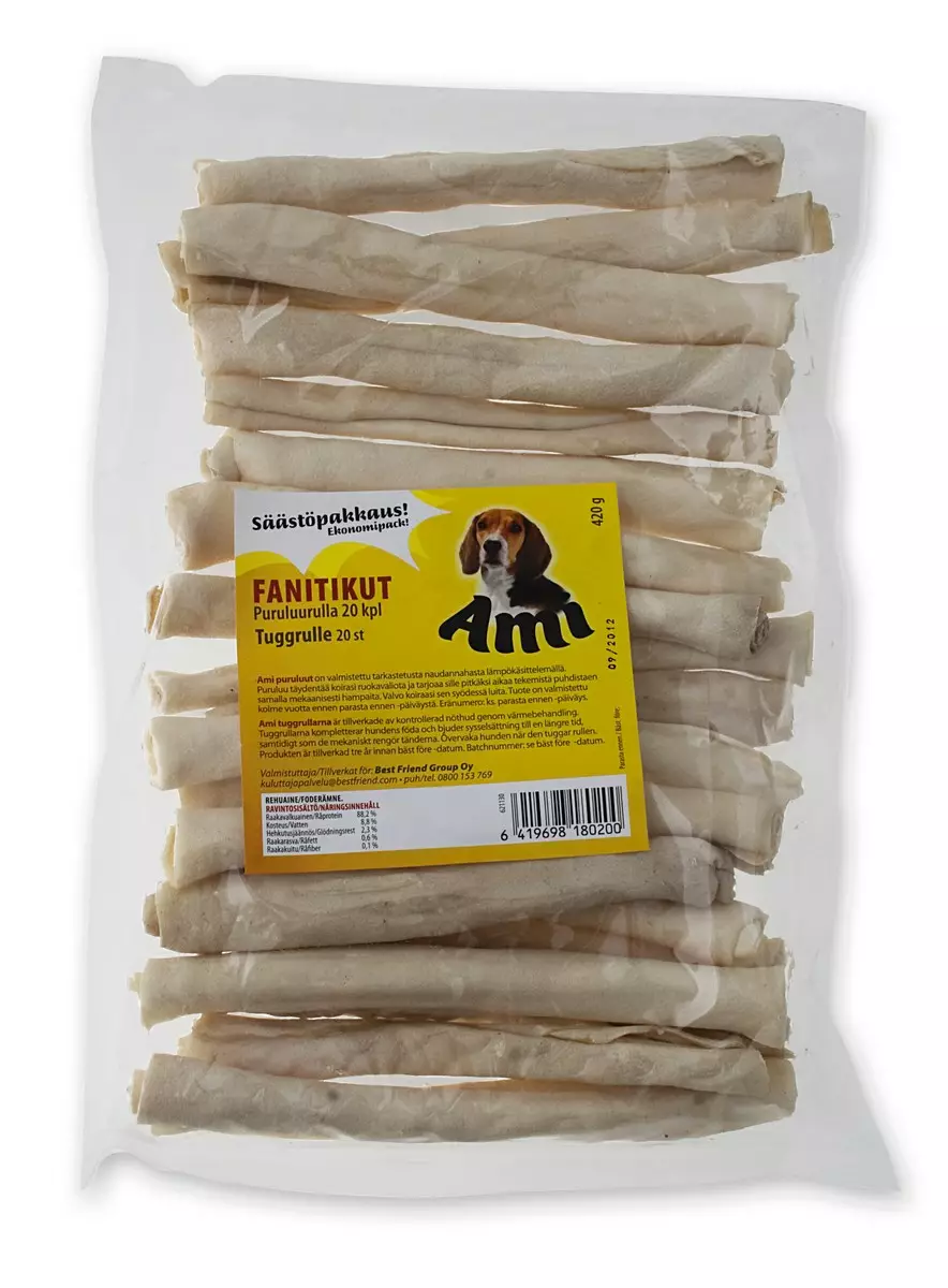 AMI FANITIKUT 420g 20kpl Fanitikut puruluurulla sopii erityisesti pienille ja keskikokoisille koirille. Luu sopii myös keskivahvalle puruvoimalle. Pussissa on 20 kpl n. 17cm vaaleaa, naudannahkaista... Lue lisää