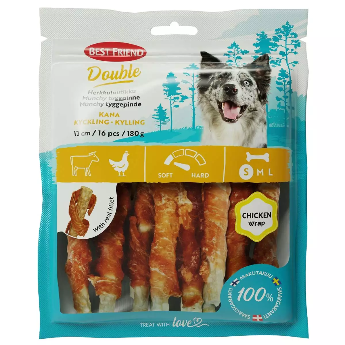 Best Friend Double -herkkuluutikku on ihanteellinen valinta pienikokoisille koirille, pennuille ja ikääntyville lemmikeille. Pehmeä koostumus tarjoaa hellävaraisen mutta miellyttävän purukokemuksen, ja aito kanafilee houkuttelee vaativammatkin herkkusuut nauttimaan.