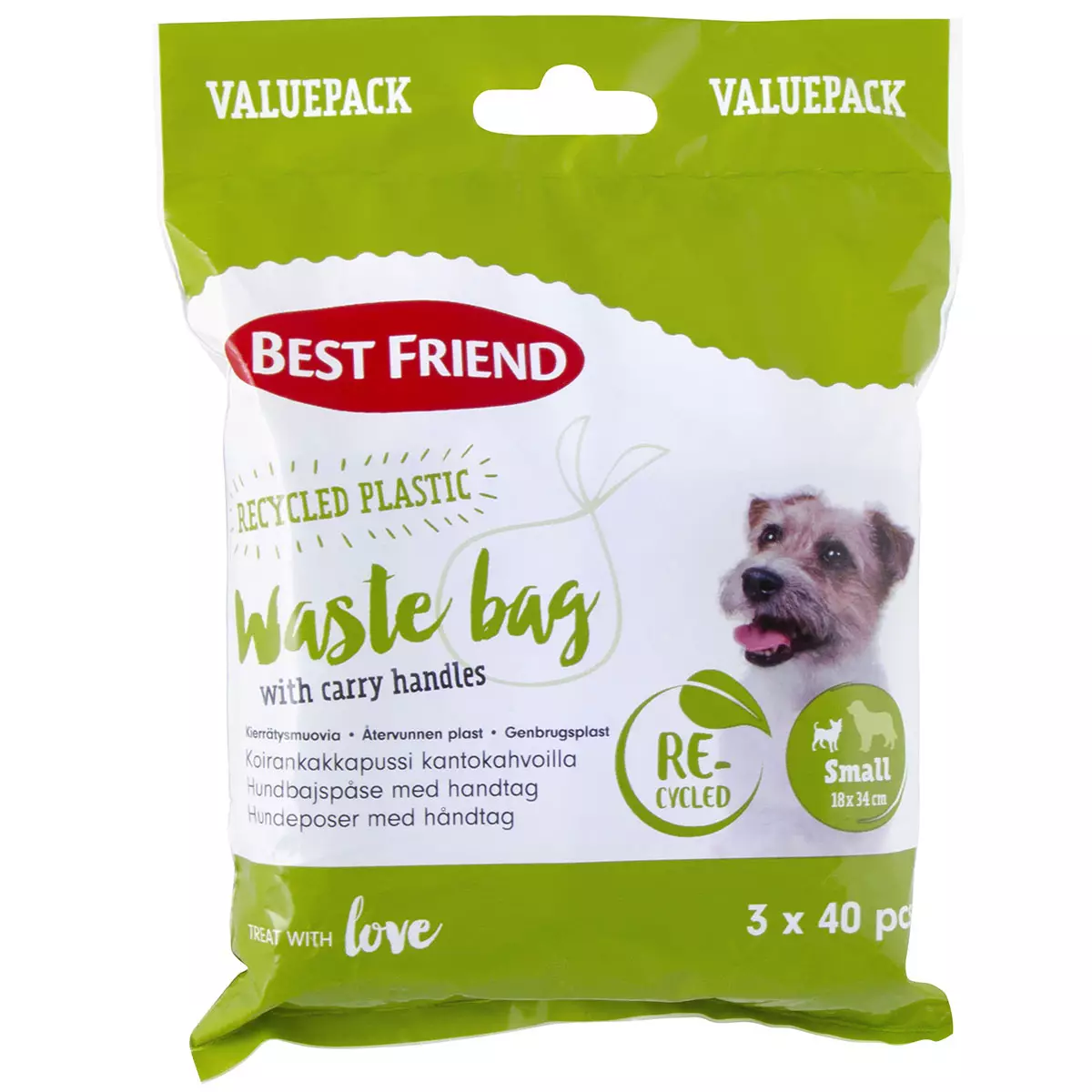 Kierrätysmuovista valmistetut kakkapussit koiran jätöksien keräämiseen ulkoilutuksen yhteydessä. Pienikokoisissa muovipusseissa on kantokahvat, jotka helpottavat koirankakkapussin sulkemista. Koiran kakkapussi monipakkaus sisältää kolme koirankakkapussirullaa, joissa on 40 kappaletta S-pussikokoisia kakkapusseja. Kantokahvallisen koirankakkapussin koko on 18x34 cm, kakkapussi soveltuu erityisesti pienemmän koiran jätöksille.