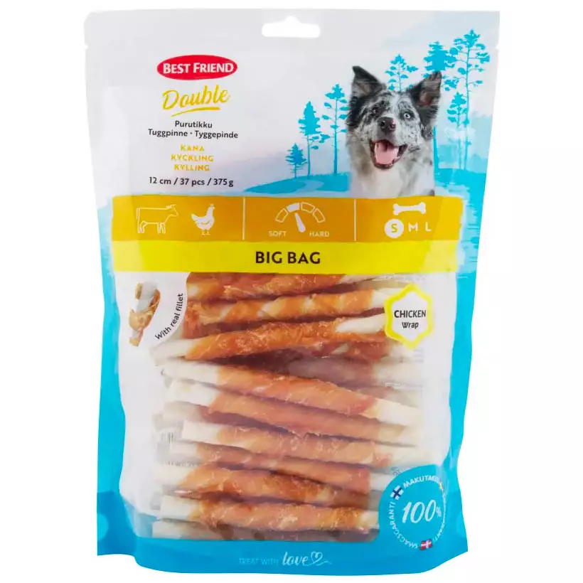 Purutikussa on herkullinen yhdistelmä korkealaatuista naudannahkaa ja aitoa kanafilettä. Sitkeä naudannahka antaa koiran hampaille sopivasti haastetta ja herkullinen kanafile aktivoi koiran luontaista puruviettiä. Double purutikku saa nirsommankin koiran innostumaan pureskelusta. Purutuotteet tarjoavat koirille ajanvietettä ja piristävät tehokkaasti tylsiä hetkiä herättäen koirien luontaisen puruvietin. Double purutikku sopii pienille ja keskikokoisille koirille, joilla on vähäinen tai keskivahva puruvoima. Suuremmille koirille purutikku sopii herkuksi tai palkkioksi.