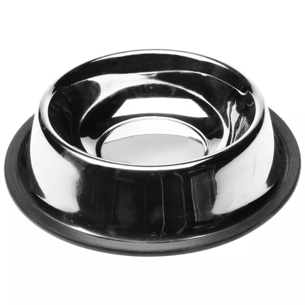 Teräksestä valmistettu pyöreä ruokakuppi lemmikille. Laadukas koiran tai kissan ruokinta-astia on viimeistelty pitävällä kumireunuksella.