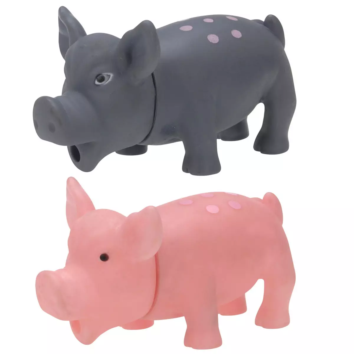 Röhkivä lelupossu koiran leikkeihin. Lajitelmasta kaksi vaihtoehtoa: vaaleanpunainen tai harmaa vinyylipossu. Pituus 15cm.