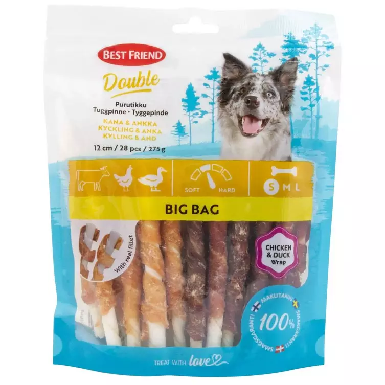 Best Friend Double kana- ja ankkafilee purutikut ovat laadukas ja herkullinen makuyhdistelmä, jotka on valmistettu korkealaatuisesta naudannahasta sekä aidoista kana- ja ankkafileistä. Best Friend puruluut on suunniteltu tarjoamaan koirallesi turvallista ja pitkäkestoista purtavaa, joka samalla myös puhdistaa koiran hampaita sekä ehkäisee pahanhajuista hengitystä.
