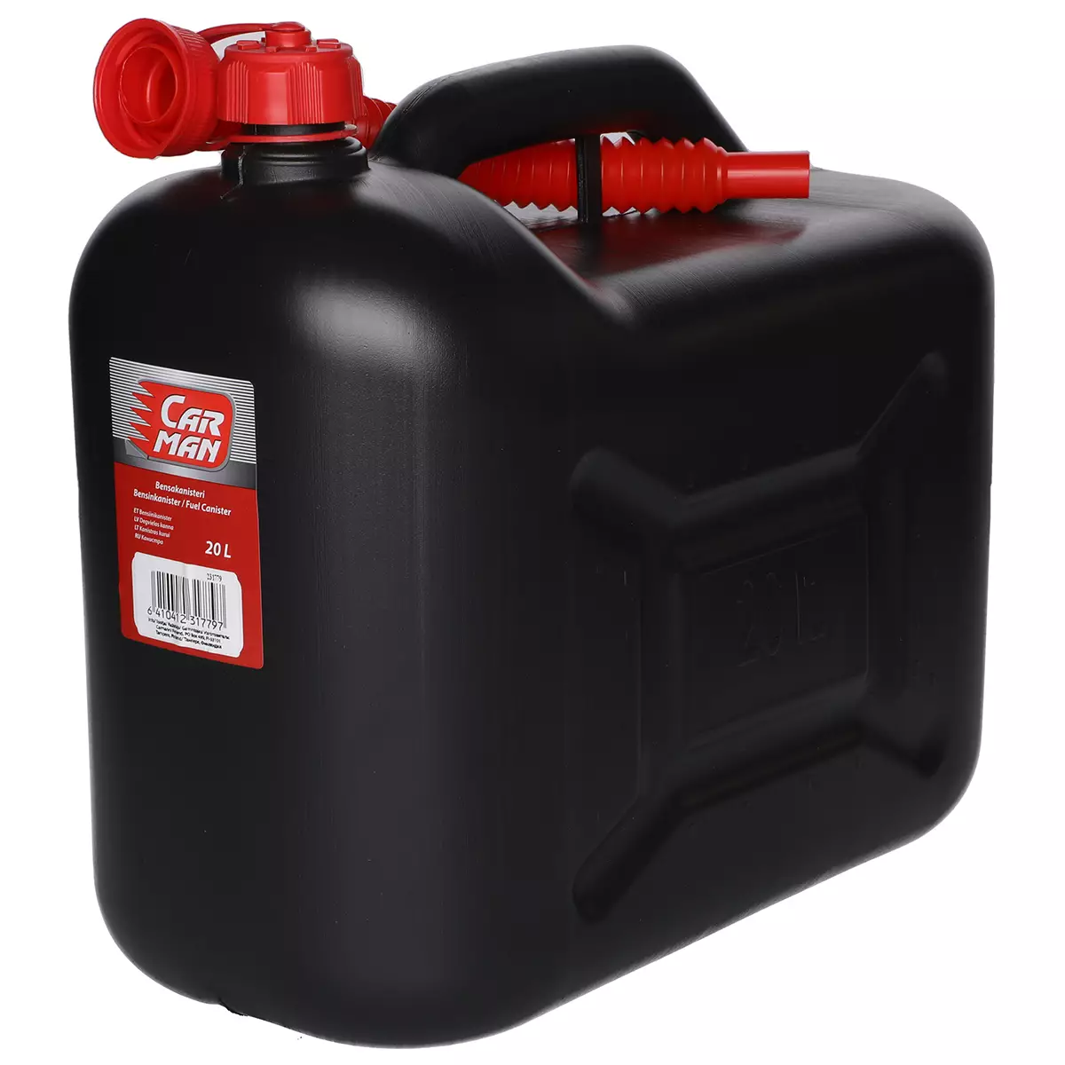 Tilava bensakanisteri irrotettavalla kaatonokalla. Muovisen kanisterin tilavuus on 20 litraa.
