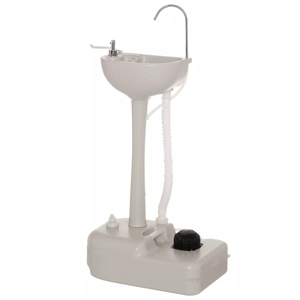Käytännöllinen käsienpesuallas toimii ilman sähköä tai vesijohtoa. Pesuallas on varustettu 17 litran vesisäiliöllä, 3 litran saippua-astialla, poistoputkella, jalkapumpulla (220ml/polkaisu) ja pyyhetelineellä. Vettä pumpataan hanasta jalkapumpun avulla. Pesuallas on kevyt ja se on helppo ottaa mukaan minne vain. Pesualtaan saa käyttövalmiiksi nopeasti, täytä vain vesisäiliö vedellä ja ota pesuallas käyttöön.