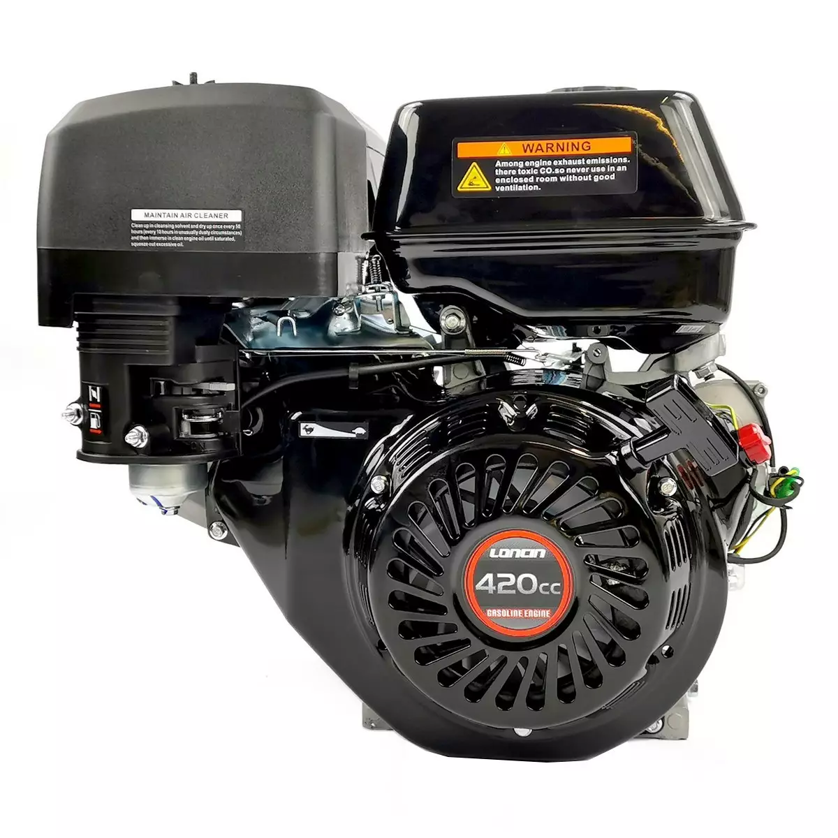 G420F Complete vaihtomoottorissa tulee mukana 15hp moottori, kaasutin, pakoputki, sähköstartti, polttoainetankki, virtakytkin, säätöpaneeli, vetokäynnistin, ilmansuodatin sekä jämäkkä moottorin suojaus. Moottori on valmiiksi kasattu, joten se on heti käyttövalmis.