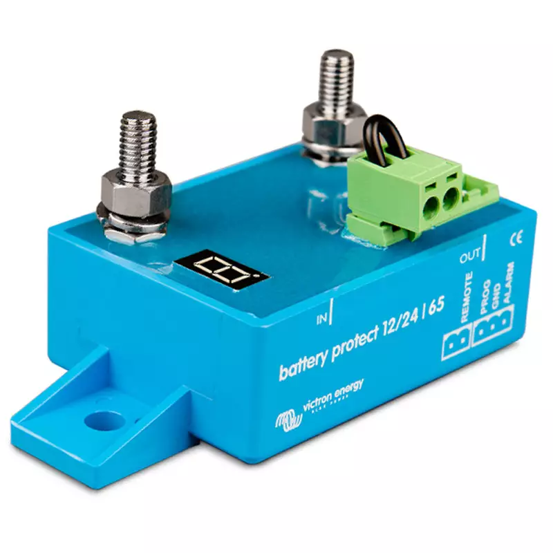 Victron BatteryProtect BP-65 suojaa akkusi syväpurkaukselta kytkemällä toisarvoiset kuormat automaattisesti irti ennen kuin akku tyhjenee haitallisesti - ja kytkee ne takaisin kun jännite on palautunut turvalliselle tasolle. Tunnistaa 12V ja 24V järjestelmät automaattisesti, ja erikoisasetus mahdollistaa suoran VE.Bus BMS -ohjauksen litiumakkujärjestelmissä. IP67-luokiteltu elektroniikka kestää veneissä ja matkailuautoissa vastaan tulevat olosuhteet.