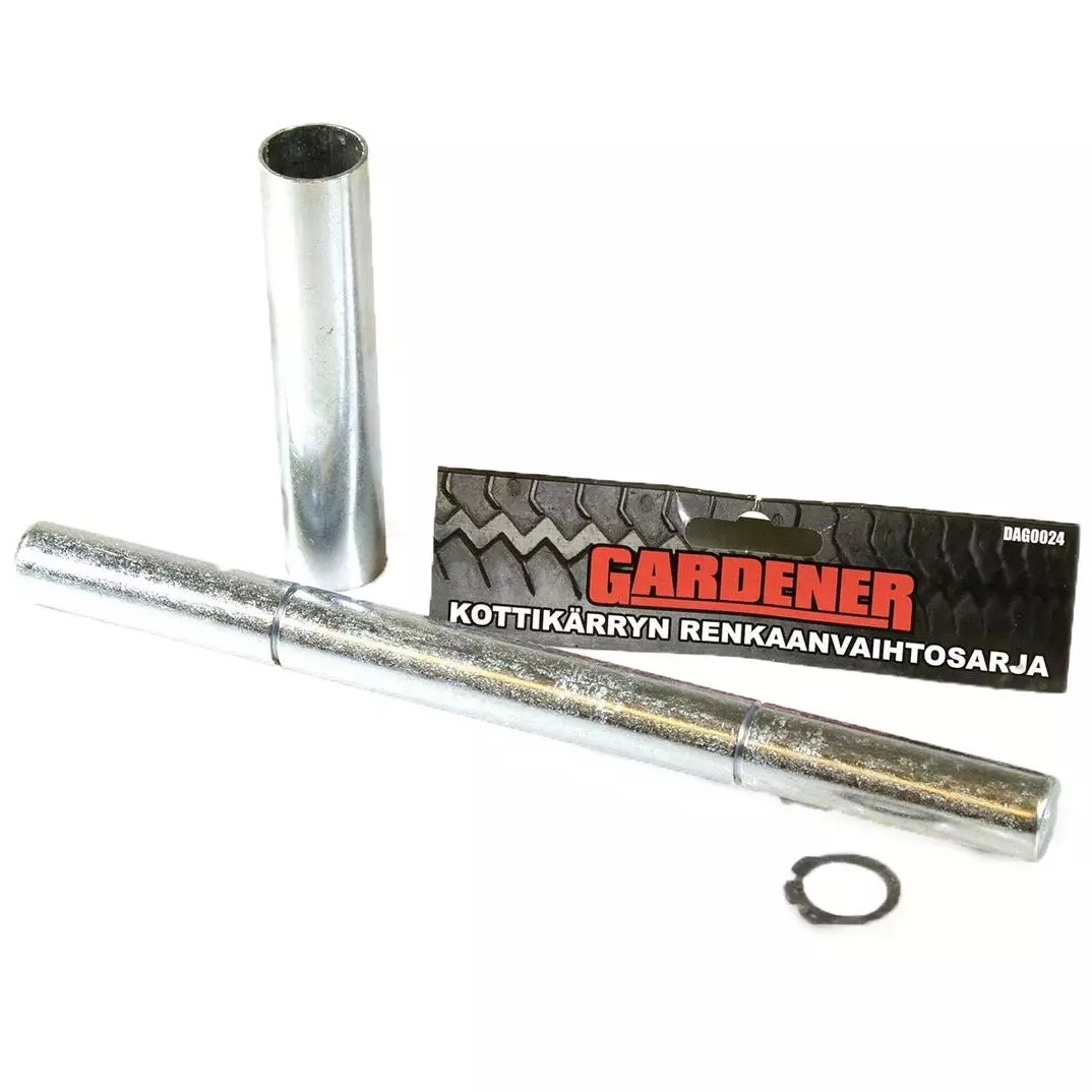 Kottikärryn renkaanvaihtosarja sisältää akselin 20x250mm, lukkorenkaat ja soviteholkin.