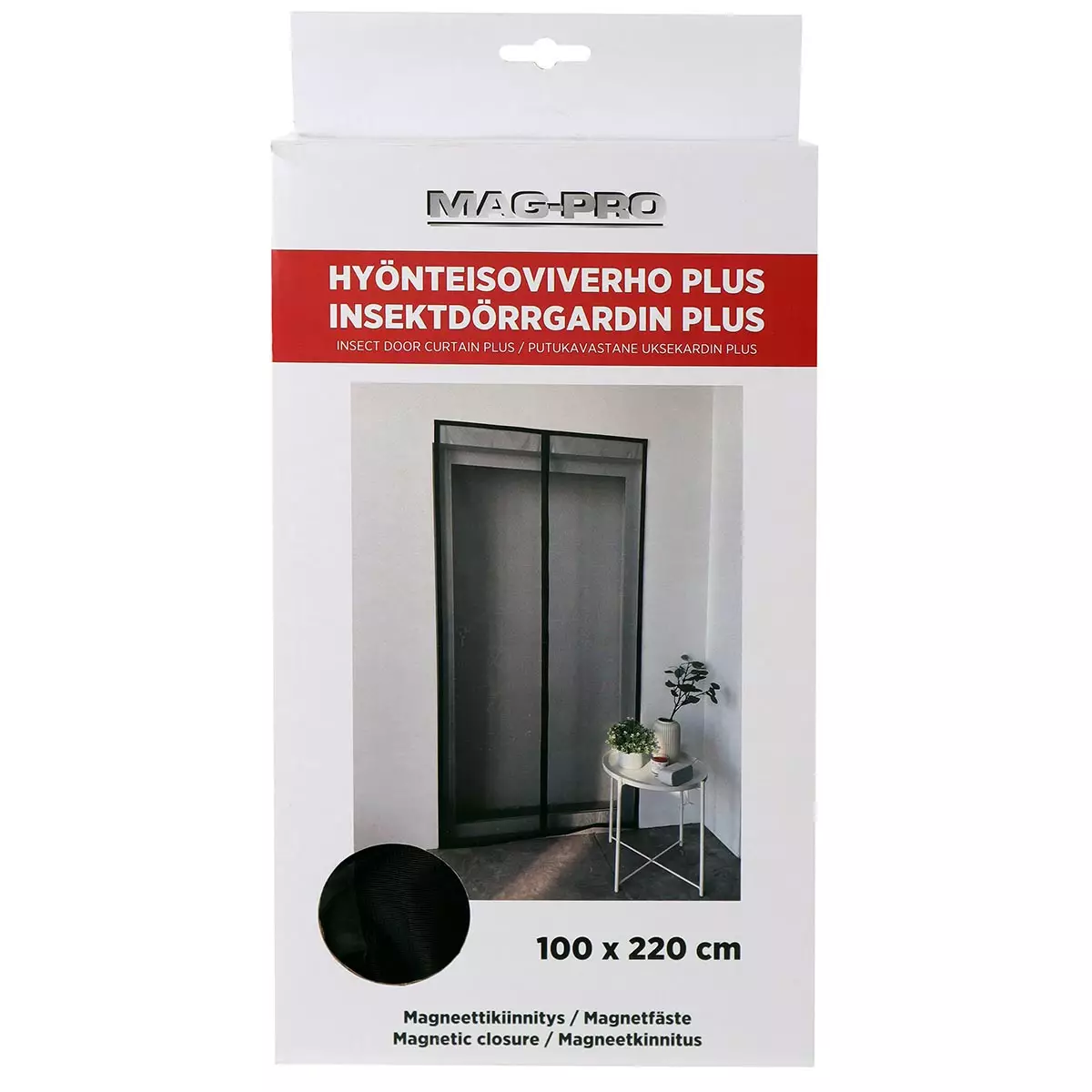 MagPro hyönteisoviverho 100x220 cm magneetilla. Estää lentävät hyönteiset, sulkeutuu automaattisesti. Kiinnitys Velcro-nauhalla, materiaali polyesteri.