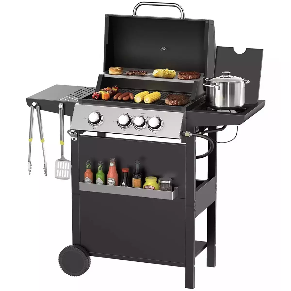 Kaasugrilli 3+1 musta tarjoaa luotettavaa grillaustehoa kesän ruoanlaittoon. Kolme ruostumattomasta teräksestä valmistettua poltinta ja erillinen sivukeitin tuottavat yhteensä 10 kW kokonaistehon, jonka ansiosta grilli kuumenee nopeasti ja lämpö jakautuu tasaisesti koko paistoalalle.