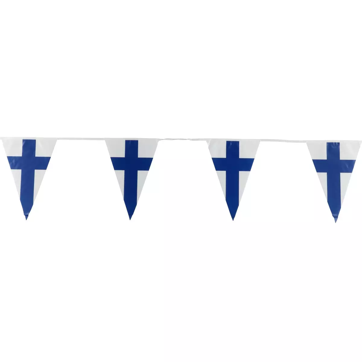 Koristele juhlatila tai ulkoalue sinivalkoisella lippuviirillä, joka herättää tunteita ja ylpeyttä. 5,8 metrin pituinen nauha sisältää 12 kolmiomaista Suomen lippua (20 x 30 cm), jotka luovat yhtenäisen ja vaikuttavan näkymän.