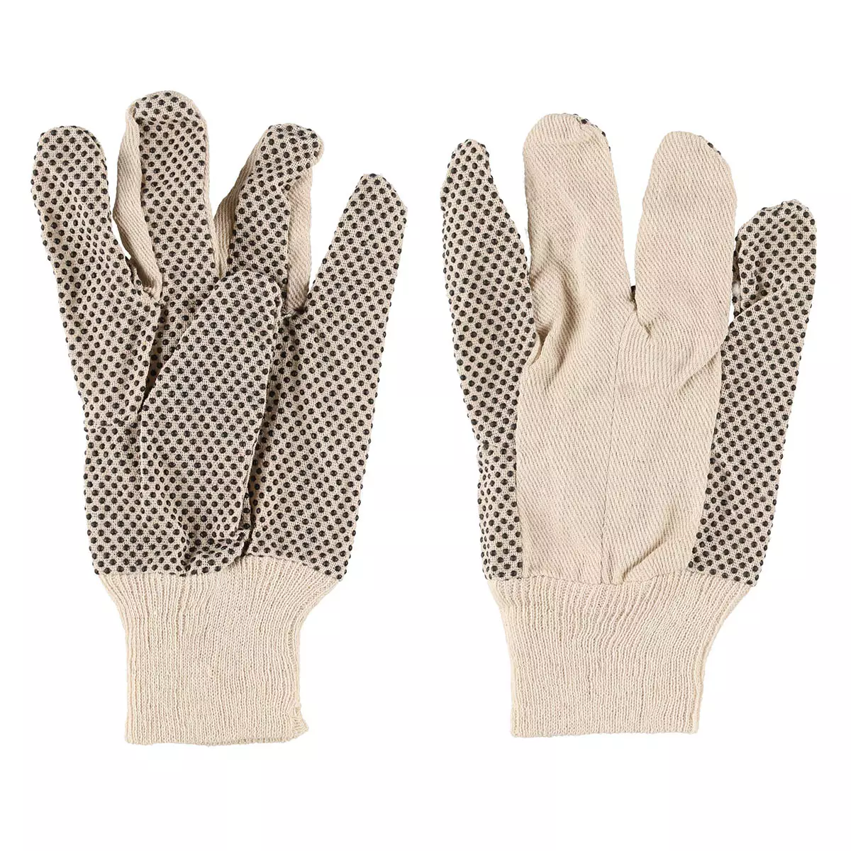 Monipuoliseen käyttöön soveltuvat näppylähanskat suojaavat käsiä erilaisissa kodin ja pihan askareissa. Mukavasti käsiin istuvat perinteiset työkäsineet ovat erinomaiset puutarhakäsineet haravointiin, puutarhatöihin, risusavottaan ja istutuksiin. Perinteisten puuvillasta valmistettujen yleiskäsineiden kämmenessä on PVC-näppylät, jotka parantavat pitoa ja otetta erilaisista työkaluista, kuten haravasta tai lapiosta. Pakkaus sisältää 12 paria monikäyttöiseen työskentelyyn soveltuvia 10,5 kokoisia työkäsineitä.