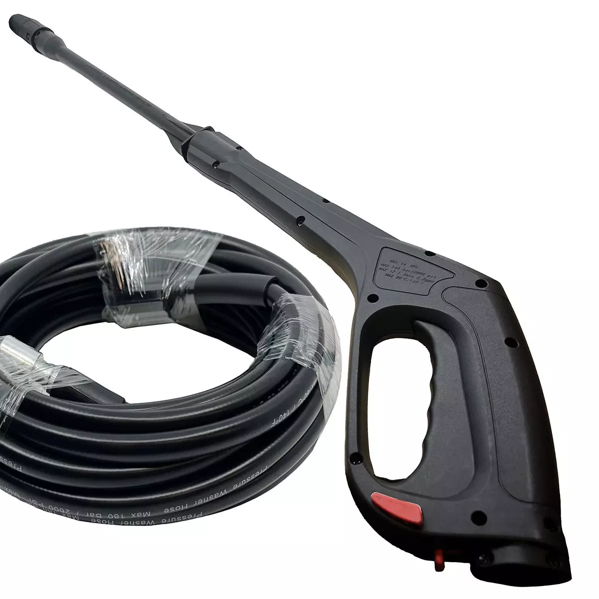 Käytännöllinen ja kestävä painepesurin pistooli + 10 metrin letkupaketti, joka sopii lähes kaikkiin painepesureihin, joissa on yleinen M22 (22mm) kierreliitäntä. Valmis kokonaisuus tekee painepesurin huollosta vaivatonta ja se myös laajentaa merkittävästi työskentelyaluetta.