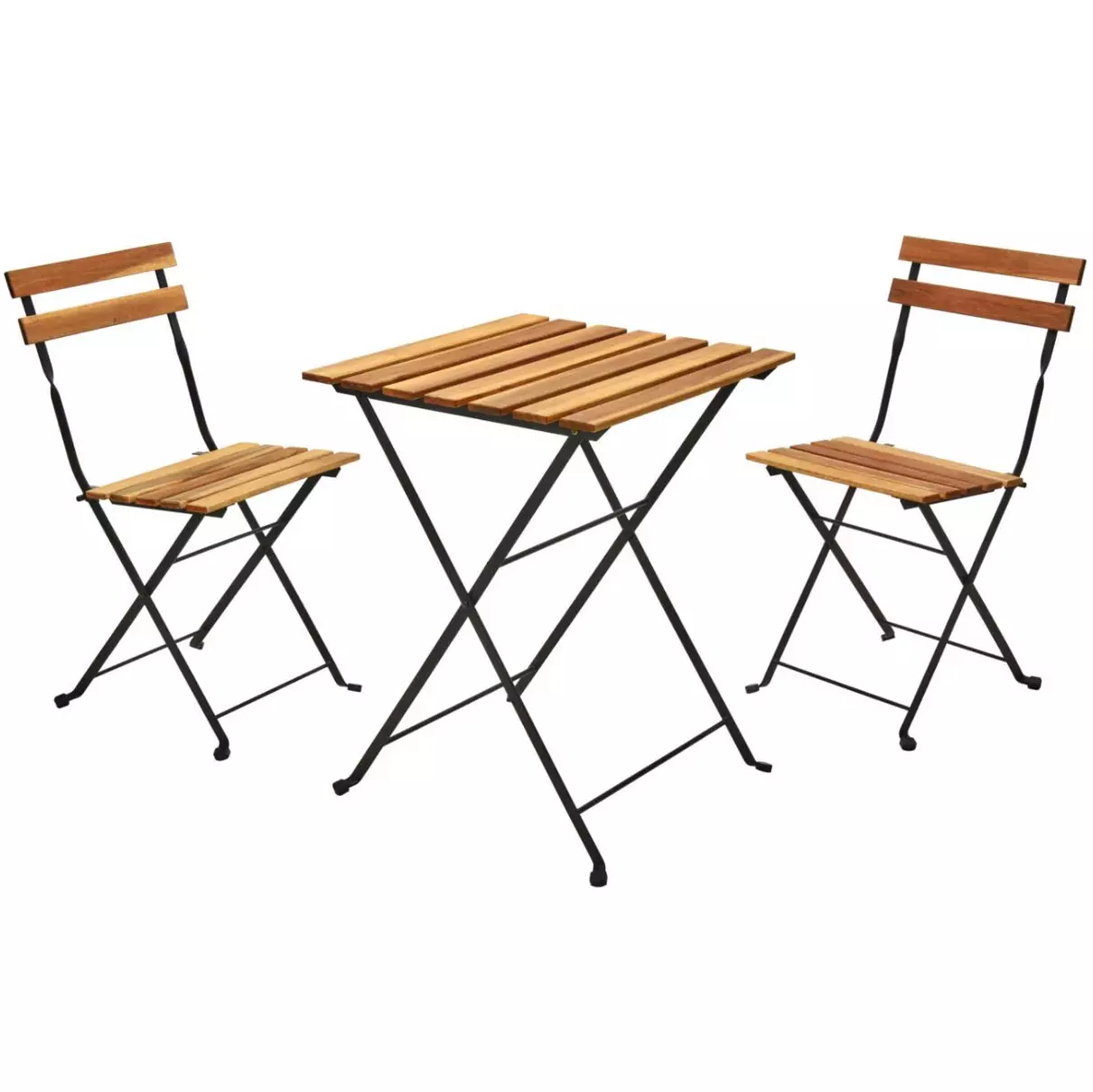 Pieneen tilaan sopiva kaunis parvekesetti Bistro Modern sisältää pöydän ja kaksi puutarhatuolia. Taittopöytä ja taittotuolit ovat materiaaliltaan lämmintä teak-look akaasiapuuta sekä mustaa metallia, joista muodostuu kaunis ja kevyt puutarhakaluste kokonaisuus kodin ja mökin sydämmeksi.