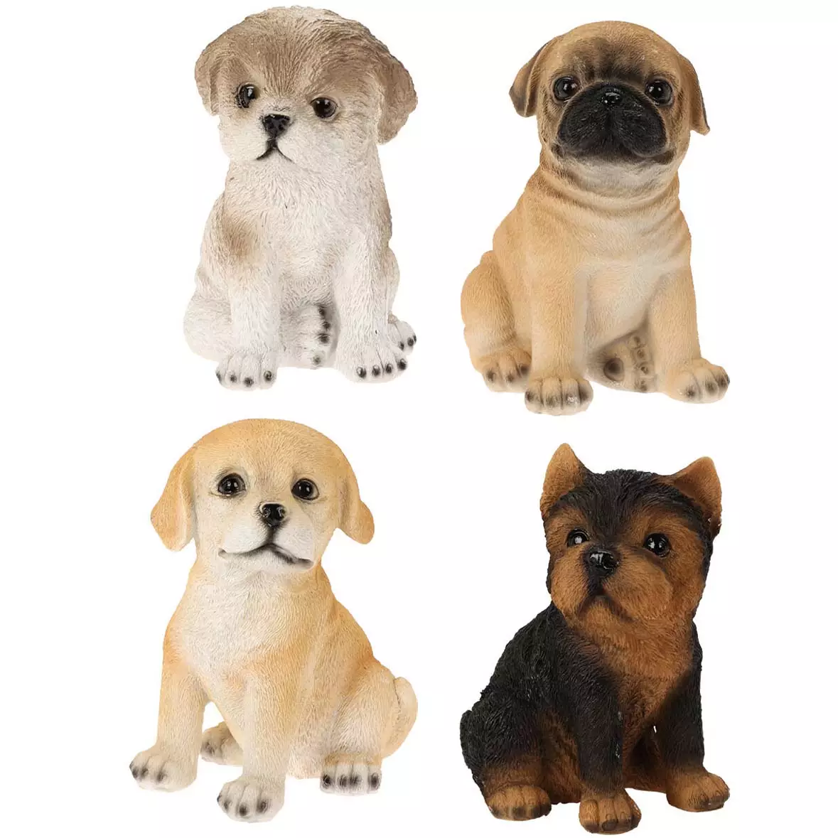 Patsaat on valmistettu polystonesta, joka kestää hyvin kosteutta ja lämpötilavaihteluita. Tämä tekee patsaasta erinomaisen valinnan ulkokäyttöön, mutta suloiset koirat toimivat yhtä hyvin myös sisätiloissa kodin tai mökin koristeena.