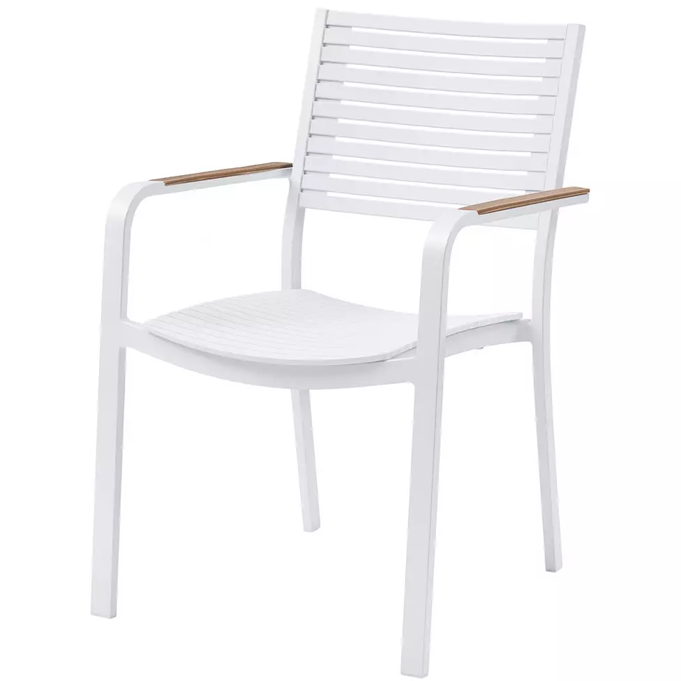 Käsinojien puujäljitelmä tuo lämpöä moderniin valkoiseen runkoon ja antaa hienostuneen viimeistelyn puutarhatuolille. Terassituoli on helppo yhdistää valkoisen tai puunvärisen pöydän kanssa.