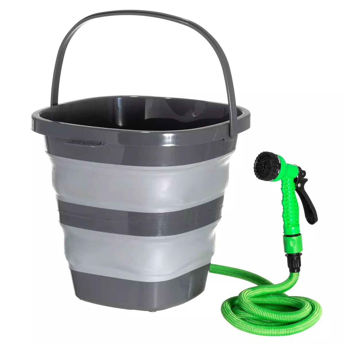 Kokoontaittuva 15 litran vesisäiliö toimii samalla kantolaukkuna. Letku ja suihkupistooli mahtuvat säiliön sisälle, jolloin kaikki tarvittava kulkee siististi mukana matkailuautossa, veneessä tai takakontissa.