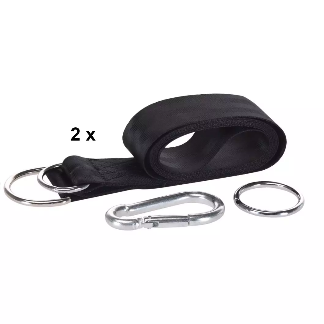 - Setti sisältää: 2 kpl 200cm x 5 cm liinaa, joissa D-renkaat päissä, 2 kpl O-renkaita, joiden halkaisija n. 63 mm sekä 2 kpl palohakoja, joiden pituus n. 10 cm