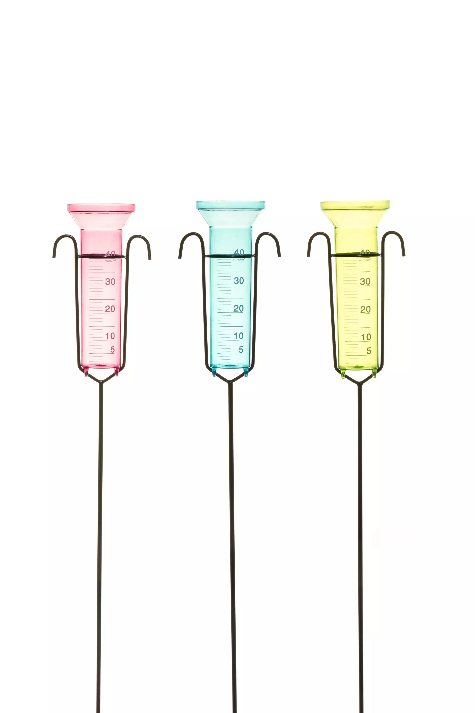Perinteinen maahan upotettava sademittari iloisen pinkin, limen tai turkoosin sävyisenä. Metallivarsi 94cm ja 40mm läpinäkyvä mittasäiliö.