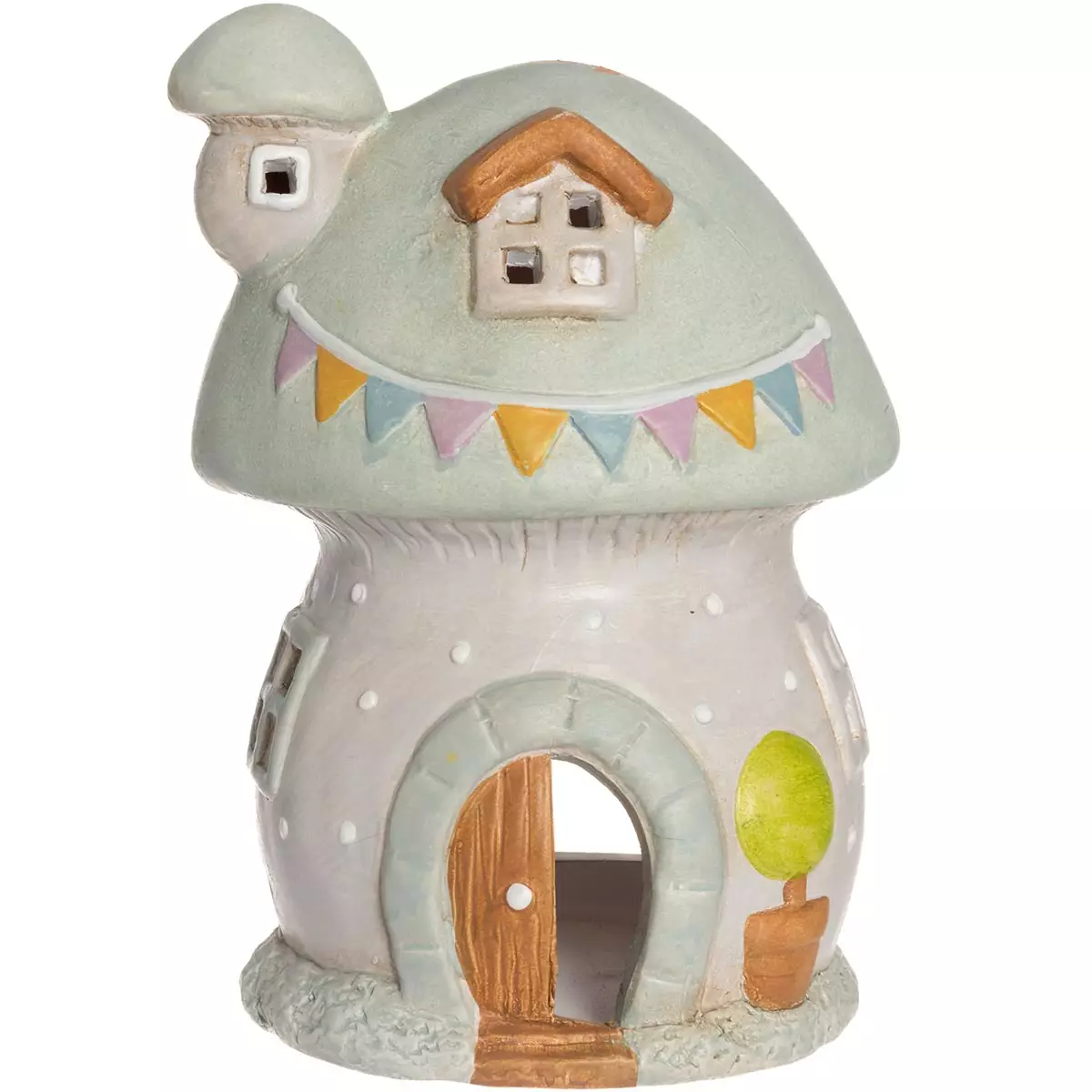 Hurmaava sienitalo luo mielikuvituksellisen tunnelman lastenhuoneeseen tai puutarhan koristeeksi. Söpöt yksityiskohdat, kuten pieni savupiippu ja värikkäät viirinauhat, tekevät koristelyhdystä iloisen ja eläväisen osan sisustusta.