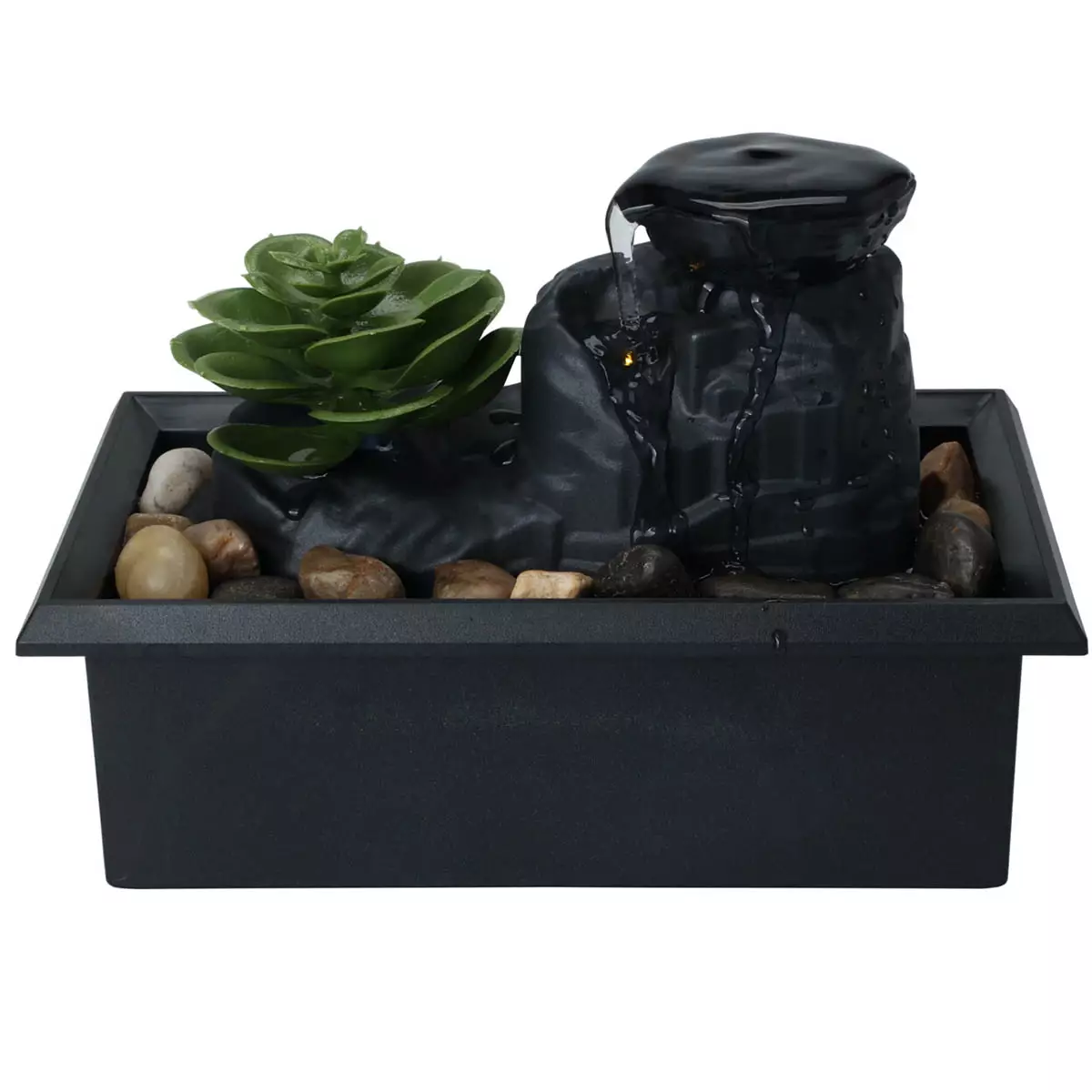 Musta suihkulähde sisältää lämpimän LED-valon, joka luo miellyttävää tunnelmavalaistusta ympäri vuorokauden. Pehmeän valaistuksen lisäksi suihkulähteen mukana toimitetaan pieniä kiviä, jotka lisäävät luonnollista viehätystä. Suihkulähteen koko on 17,5 cm x 10 cm x 11,5 cm ja se toimii kahdella AA-paristolla. Paristot eivät sisälly pakkaukseen.