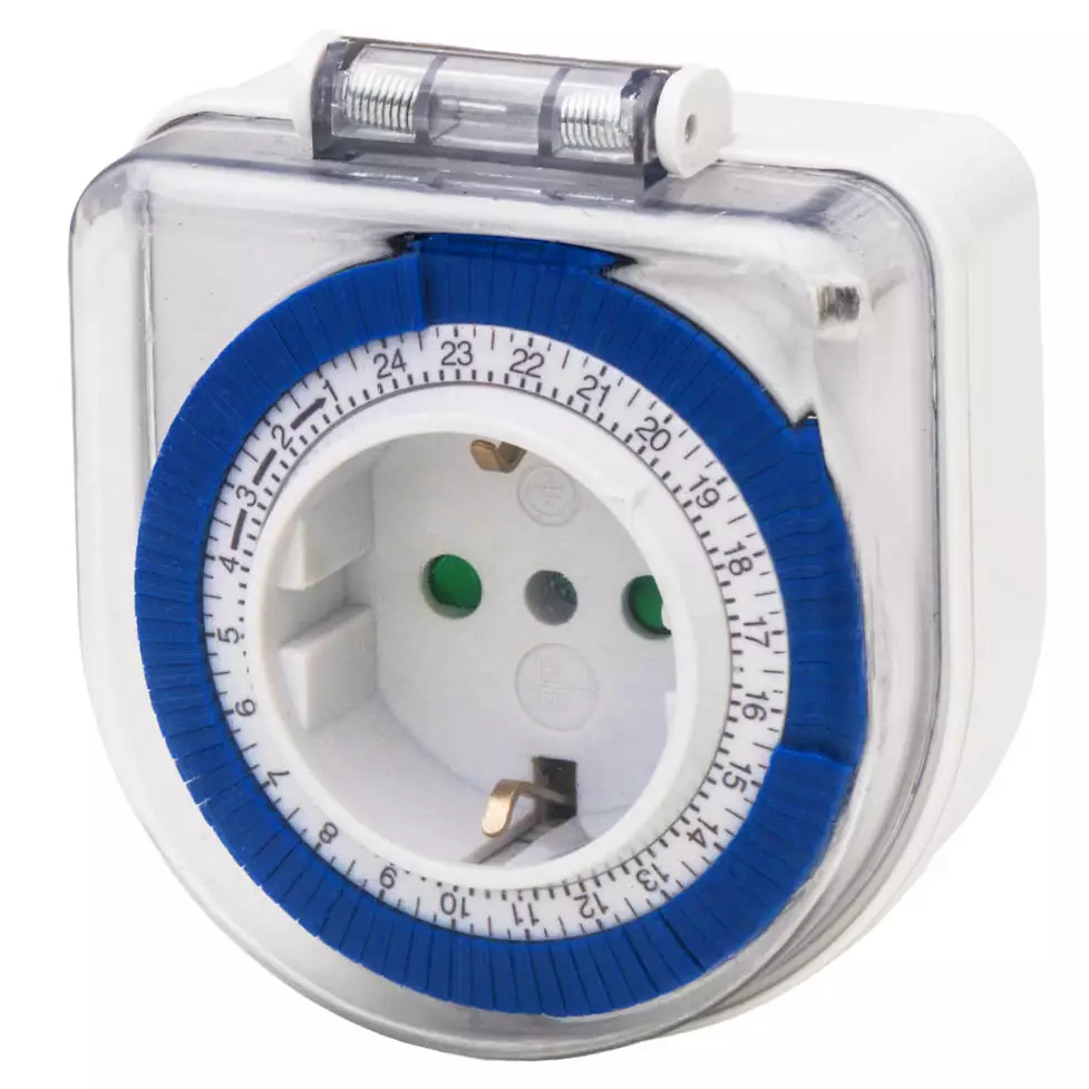 Ulkokäyttöön soveltuva ajastinkello pitkällä pistotulpalla. Esimerkiksi auton lämmityksen ja ulkovalojen ajastukseen.