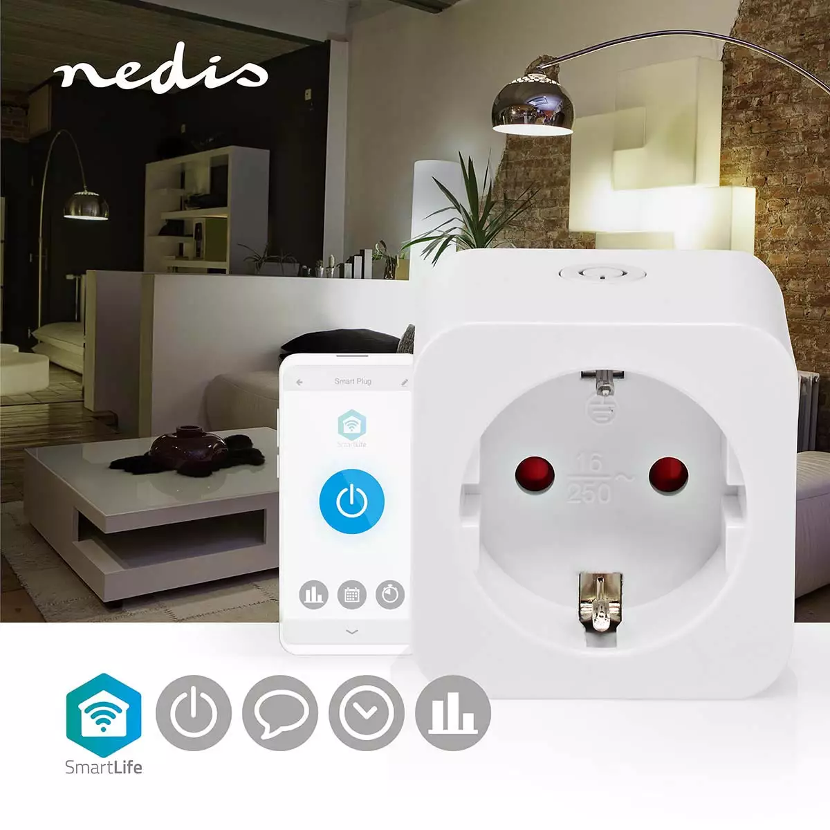 Etäohjattava älypistorasia on energiatehokas valinta kodin sähkölaitteille, kuten pyykinpesukoneelle, lämmittimelle, sähkötakalle ja monille muille kodin suuremmille sähkölaitteille. Älypistorasia kiinnitetään kodin tavalliseen 230 V:n pistorasiaan ja sähkölaite kiinnitetään Nediksen pistorasiaan. Nedis SmartLife -pistorasia voidaan liittää kodin wi-fi verkkoon, jolloin pistorasiaa voidaan ohjata ja seurata mobiililaitteen avulla etänä mistä ja milloin vain.