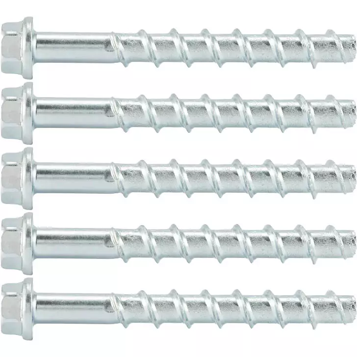 Pakkaukseen sisältyy 5 kpl halkaisijaltaan 6 mm ja pituudeltaan 80 mm betoniruuveja, joissa on kuusiokanta. Betoniruuvit on valmistettu sinkitystä teräksestä.