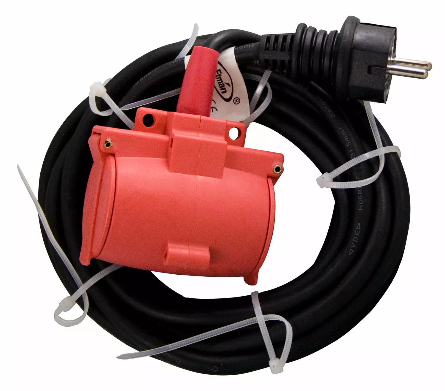 Vahva, turvallinen kumipintainen ulkojatkojohto kahdella roiskevesitiiviillä pistorasialla.