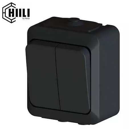 Tyylikäs Harjun Hiili-sarjan 1/6 kytkin on väriltään mattamusta. Pinta-asennettava valokatkaisija sopii kodin kuiviin tiloihin.